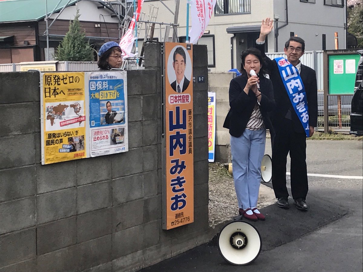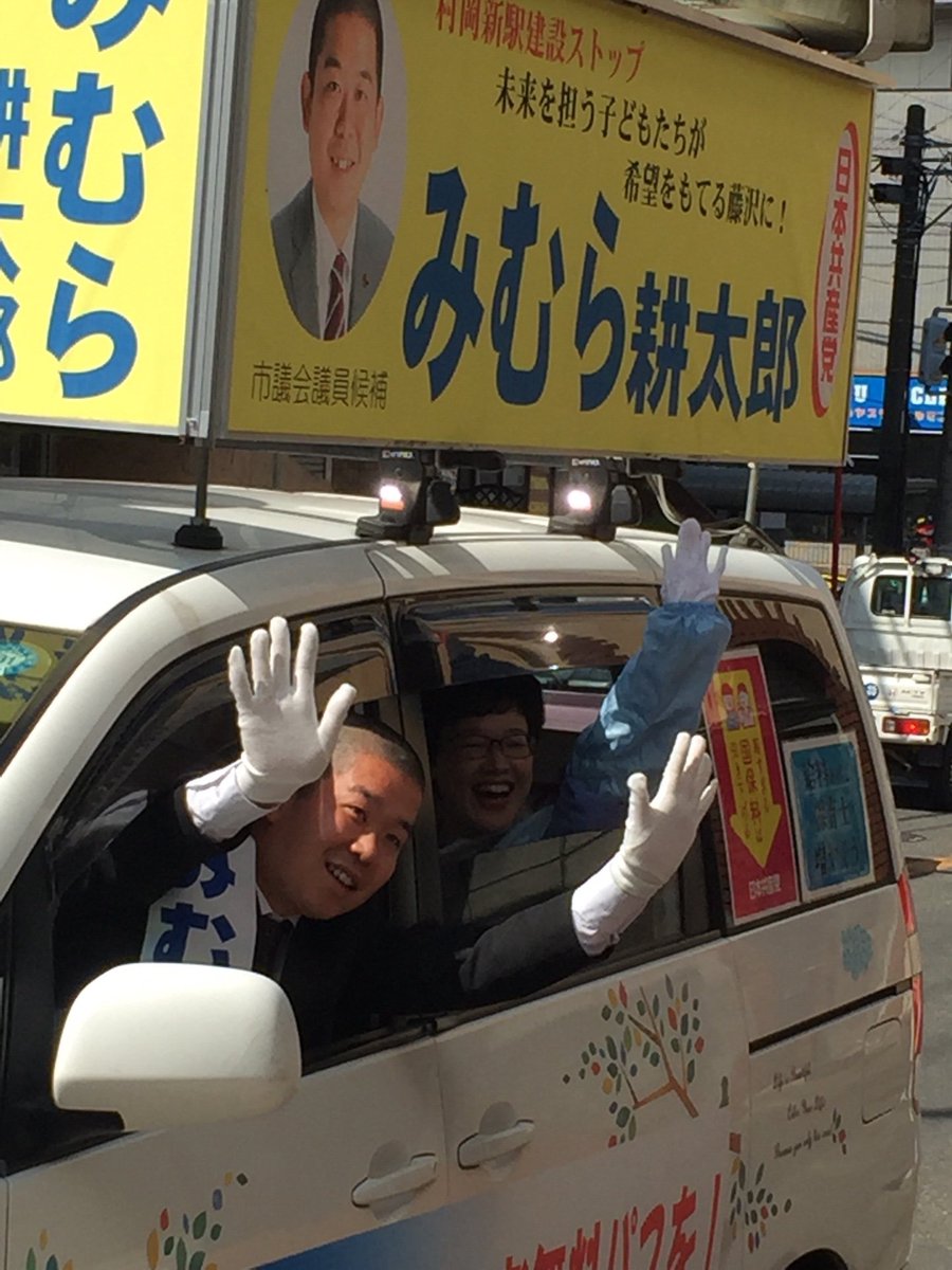 定数36に49人が立候補した藤沢市議選、議員団長の柳沢じゅんじ市議候補、土屋としのり市議候補、山内みきお市議候補、みむら耕太郎市議候補の4人が元気よく出陣しました。
